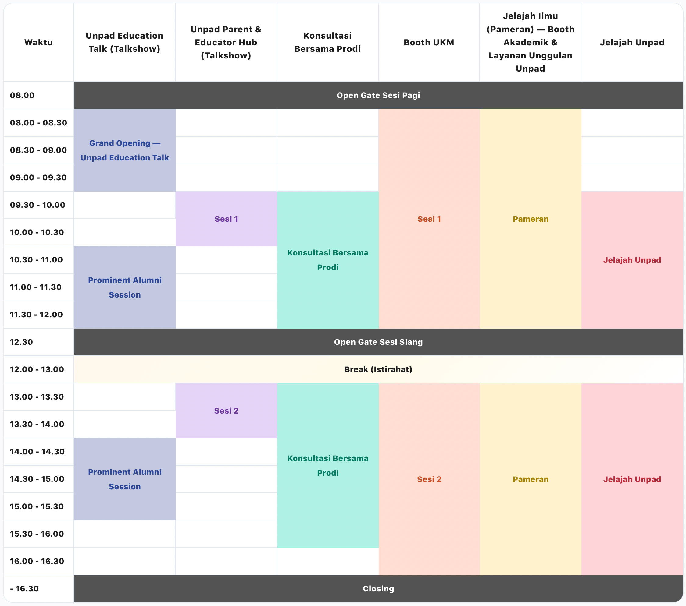 Waktu Unpad Education Talk (Talkshow) Unpad Parent & Educator Hub (Talkshow) Konsultasi Bersama Prodi Booth UKM Jelajah Ilmu (Pameran) — Booth Akademik & Layanan Unggulan Unpad Jelajah Unpad